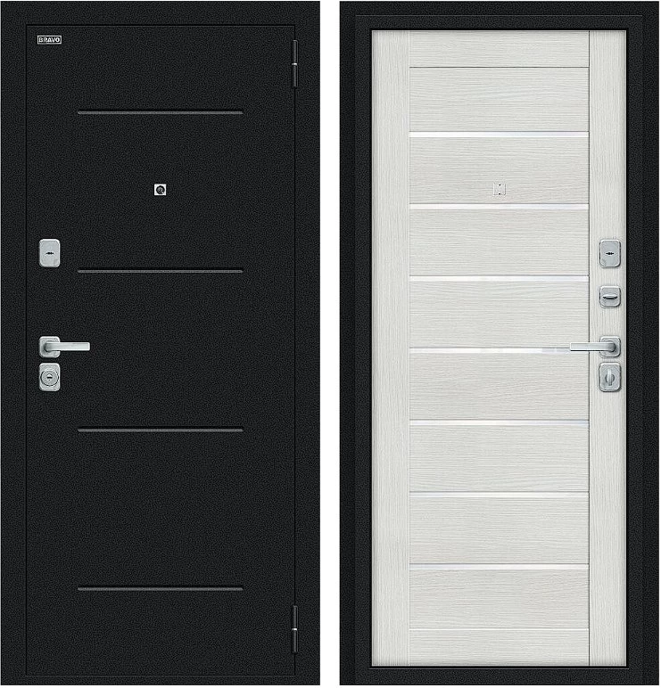 Надежная входная Дверь Браво Техно/BChrome Букле черное/Bianco Melinga премиум класса по цене 36 130 руб. Большая толщина стали защитит от проникновения в ваш дом, квартиру или коттедж. Используется очень качественная фурнитура: замки, цилиндры, ручки, защелки. Покрытие и отделка двери изготовлено под внимательным контролем производителя. Дверь имеет долгий срок службы и гарантию.